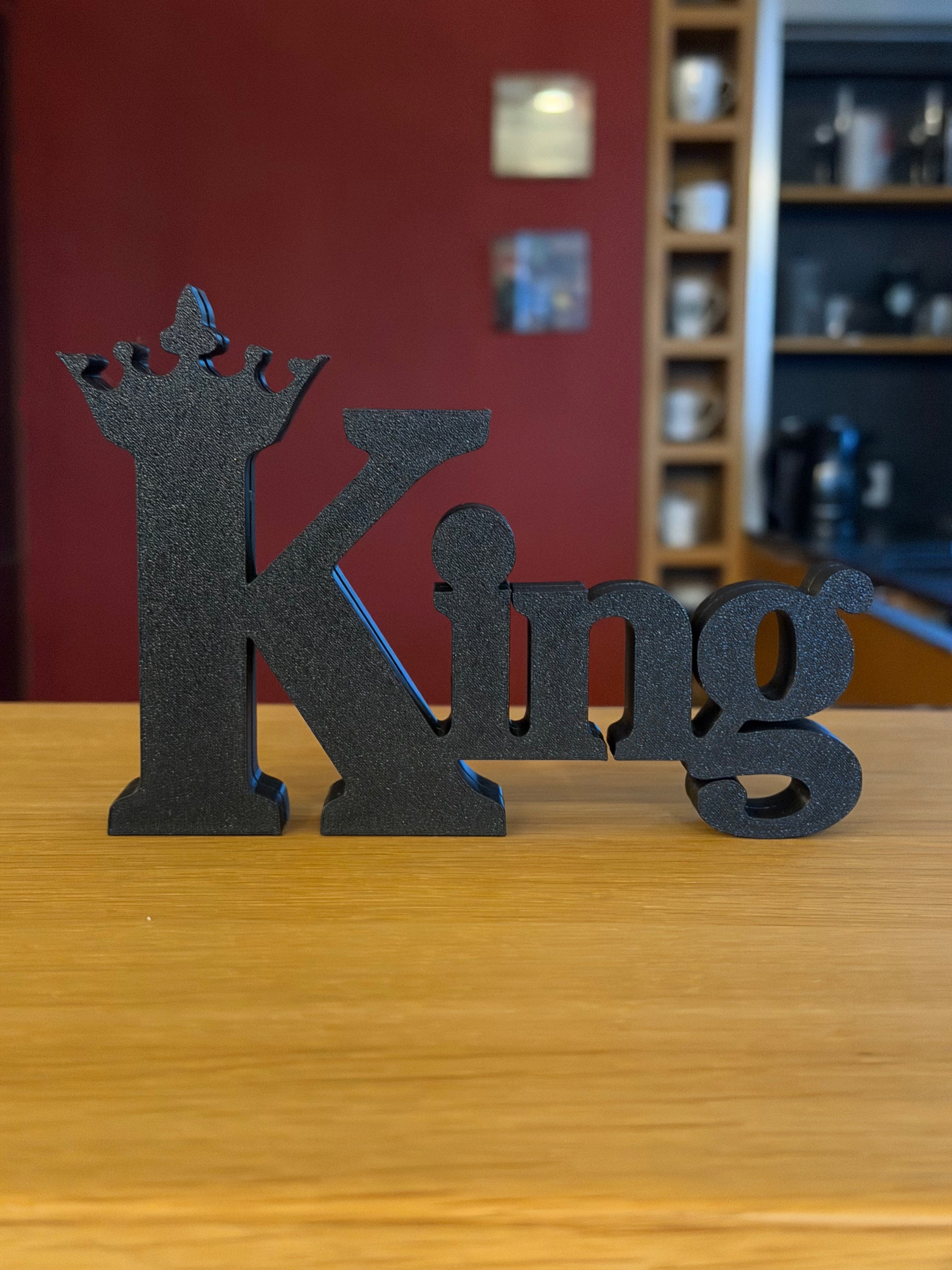 Show your favorite photo in a strong and stylish way with this frameless 3D printed “King” photo frame with crown design. The open photo space is built into the word, creating a bold modern display that stands on its own. Perfect for desks, shelves, bedside tables, and office décor.